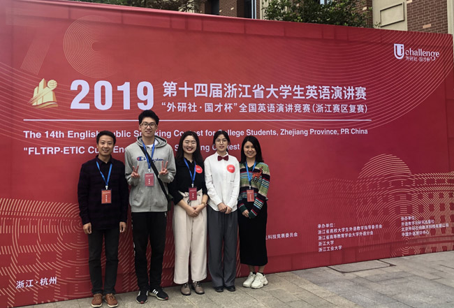 2019年10月26日-10月27日,第十四届浙江省大学生英语演讲竞赛暨“外研社 国才杯”全国英语演讲大赛浙江省复赛在浙江工业大学举行。通过上半年举行的校赛,DB彩票 选拔出了英语181班吴肖睿同学、金融171班的张英杰同学、电气171班的潘汀莹同学代表DB彩票 参加比赛。指导老师徐梁峰和邓韵声从暑假开始就和三位选手钻研题目,撰写演讲稿,并一遍遍地打磨直至满意为止。开学后,每周召集选手们进行半天的集训,就语音语调、台风表情、即兴问答等方面进行不断的讨论和完善。