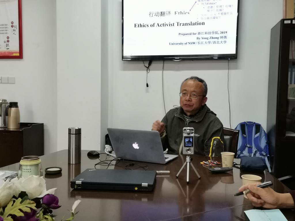 12月6日(周五)下午,应外国语DB彩票 /DB彩票 的邀请,新南威尔士大学钟勇教授在闻理园A3-306作了题为“行动翻译操守:基于三个个案的分析”的主题讲座,DB彩票 翻译研究所成员和英语专业学生参加了此次讲座,讲座由外国语DB彩票 /DB彩票 院长朱吉梅教授主持。
