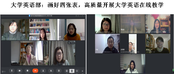 大学英语部承担着全校2018级、2019级6000多名学生的大学英语教学。根据DB彩票 新冠肺炎疫情防控工作要求,结合教务处本科教学安排,从2月初开始积极筹备大学英语在线教学,努力画好“四张表”,做好四个方面工作:一是抓协调组织,画好责任分工表,成立教学副院长、大外部主任、副主任、课程组长为成员的在线教学筹备工作小组,多次召开视频研讨,确保DB彩票 决策部署第一时间学习传达,并按照“线下学习,线上互动,平台展示”教学理念,合理制定网上教学实施方案和管理方案;二是抓学生排摸,画好班级选课表,利用微信、QQ、钉钉等新媒体工具,建立学生选课情况名单信息库,任课教师向每位学生调查了解在线教学需求和学习保障需求,对在线教学困难学生给予指导帮助;三是抓课程质量,画好教学模块表,大学英语课程分3个层次,4个模块课程教学,各课程组分头召开视频会议,进行网上教学研讨,统一规划学习内容,设计开发网上学习资源,保证学习资源质量。四是抓模拟演练,画好平台操作表,各课程组提前一周分头组织师生利用钉钉、QQ直播等平台开展网上教学测试工作,编印师生在线学习注意事项小指南,明确大学英语在线教学精准安排,不断提高师生在线教学的主动性和自觉性,确保高质量开展大学英语在线教学。