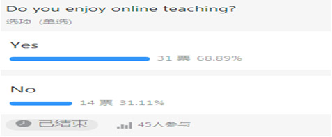 从投票结果发现,喜欢网络教学的学生占比接近70%,该比例与教务处所统计的“浙江科技DB彩票 网络教学质量日报”中的比例惊人相似。看到这个数据顺便可以进行现场教学,如何用英语描述统计结果。
