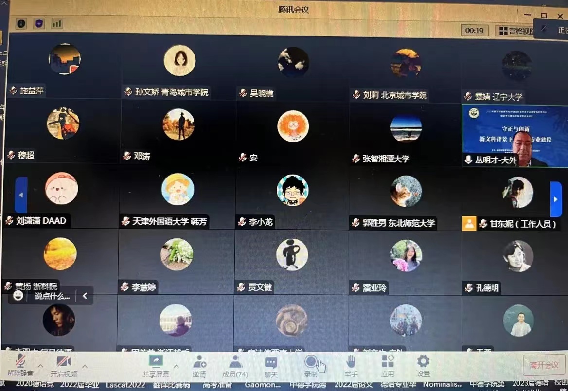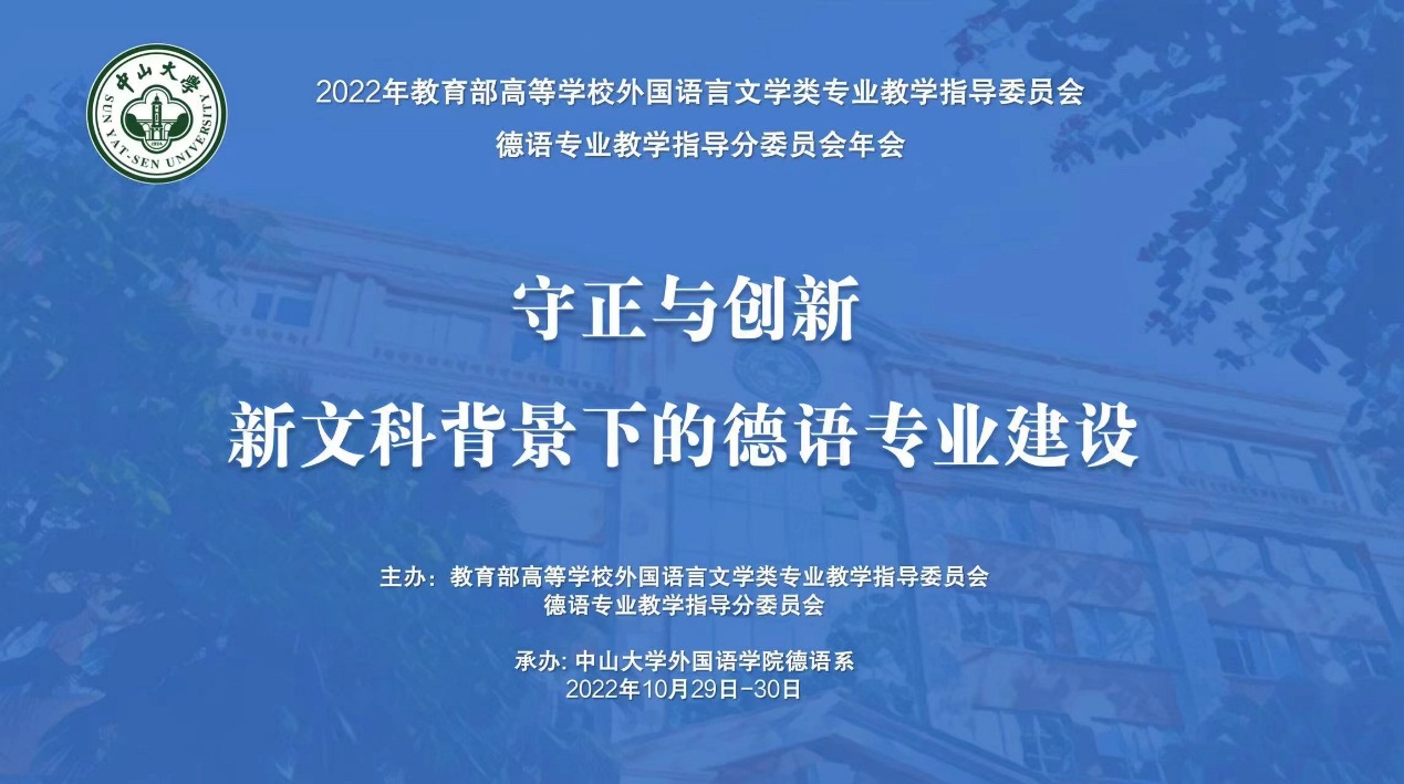 2022年10月29-30日,教育部高等DB彩票 外国语言文学类专业教学指导委员会德语专业教学指导分委会年会“守正与创新 新文科教育背景下的德语专业建设”在线上隆重举行。本次年会由教育部外指委德分委主办,中山大学外国语DB彩票 德语系承办。来自歌德DB彩票 、德国学术交流中心、全国一百余所高校德语专业以及外语教学与研究出版社、上海外语教育出版社的近百余名专家学者出席会议。DB彩票 教学副院长黄扬、德语系系主任林方、德语系副系主任施益萍等参加会议。林方还参加了29日下午的题为“新形势下德语专业教学的守正与创新”分小组讨论,介绍DB彩票 德语专业在培养方案改革、人才培养和教师发展方面的守正与创新的实践和探索,并和其他高校德语专业同仁们共同探讨了德语专业建设和人才培养的发展方向。