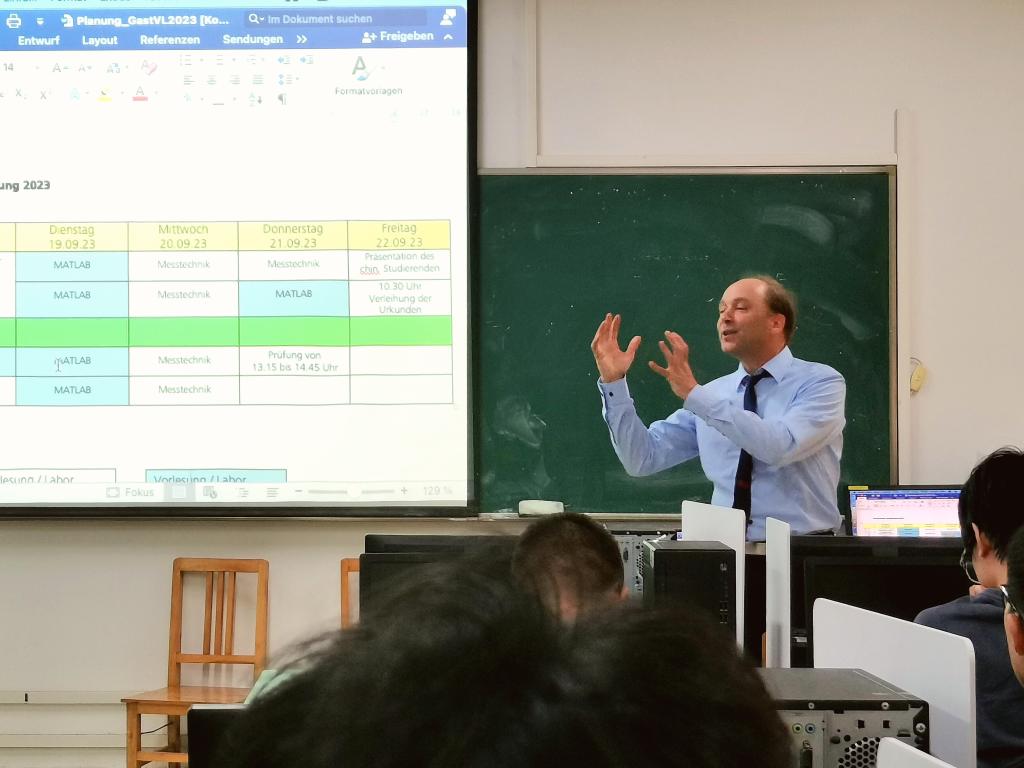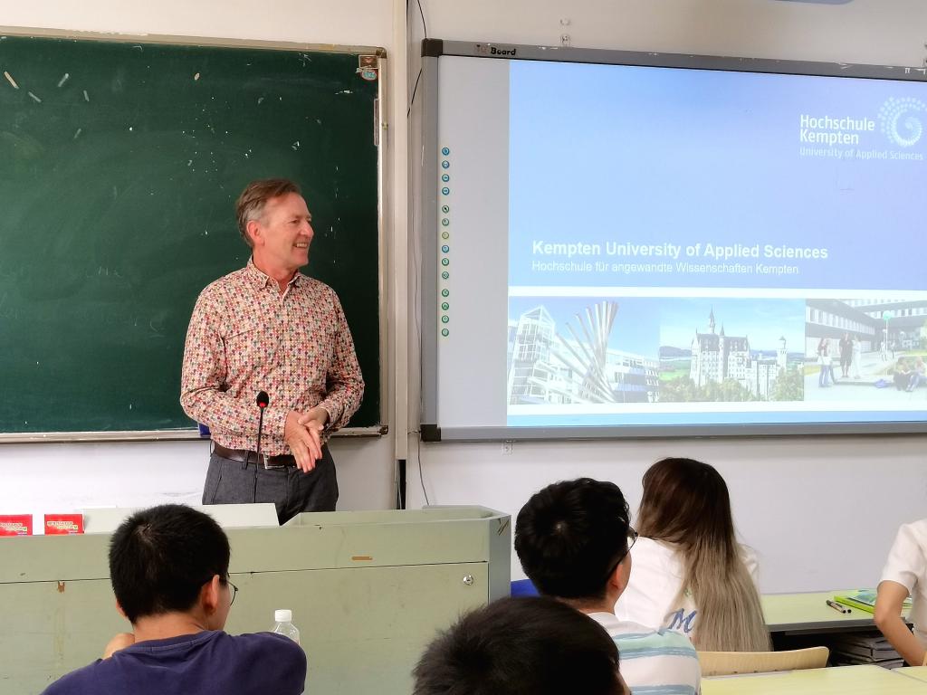 2023年9月18日,肯普滕应用科学大学国际处处长Bernd Holzhauser、经管DB彩票 国际事务负责人Martin Göbl来访DB彩票 并开设讲座。DB彩票 院长韩晓亚、书记阮小波、国际处德语国家项目主管李昱颖出席讲座。Holzhauser先生与中德联合培养“2+3”项目机械专业和工业工程专业学生进行了深入交流,对肯普滕应用科学大学的办学状况、专业特点、课程设置等内容做了详细介绍,同时也欢迎同学们今后去肯普滕应用科学大学就读。
