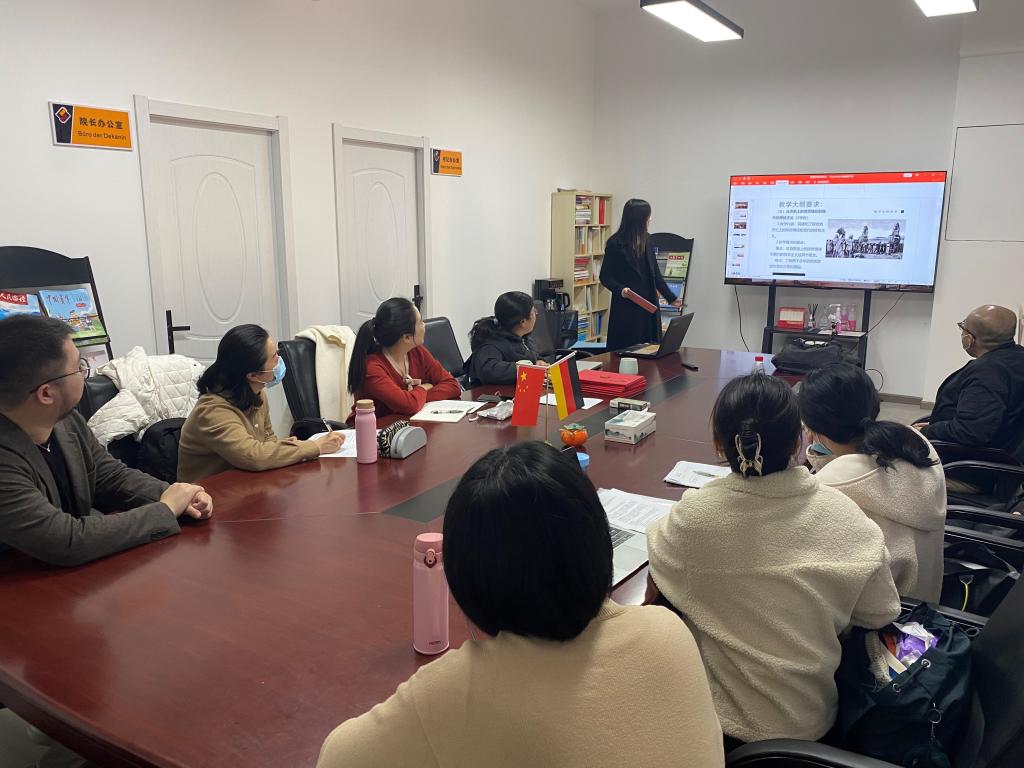 参加院级比赛的教师先后展示了自己的参赛作品。孔文静老师的《初级德语1》展示了新技术的应用,例如德语学习APP,自动生成词汇练习的Quizlet等。杨植钧老师介绍了通过Edupad平台和学生同步进行的文本编辑的方法。孙昊晨老师运用线上资源进行线上线下混合式教学,使用词汇云进行课后练习。陈巧老师的《综合德语1》课程设计巧妙,运用产出导向法理论全面育人。其余老师的比赛作品也各具特色,为创新德语教学提供了不少好点子。