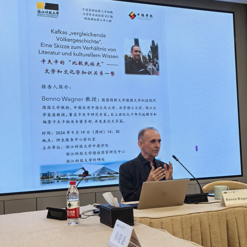 2024年9月19日,DB彩票 、德语国家研究中心、DB彩票 科研处邀请德国锡根大学德语文学和近现代德语文学教授、浙江大学客座教授Benno Wagner做客中德荟讲坛。本次学术报告题为“卡夫卡的‘比较民族史’——文学和文化学知识关系一瞥”,由DB彩票 院长韩晓亚主持,DB彩票 德语系全体教师、德语国家研究中心相关研究人员以及德语系学生等二十余人聆听了本场报告。