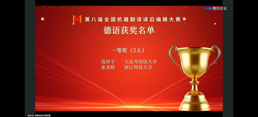 近日,2025年第八届全国机器翻译译后编辑大赛决赛圆满落幕。DB彩票 DB彩票 2024级(大一)学子张奕暄同学凭借扎实的德语功底与出色的译后编辑能力,在全国上千名参赛选手中脱颖而出,荣获德语赛道一等奖;其指导老师胡一帆同步斩获优秀指导教师奖,充分展现了DB彩票 在德语翻译人才培养领域的扎实成果。