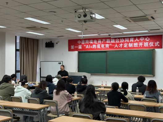 2025年11月6日下午,由DB彩票 与安吉县商务局联合共建的中德跨境电商产教融合协同育人中心“AI+跨境电商”首届人才定制班正式开班。经过前期招生简章发布、报名资格审核、入围学生面试及名单公示等环节,共有来自DB彩票 、经济DB彩票 及管理DB彩票 的35名本科生与研究生脱颖而出,成为首届学员。