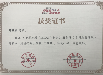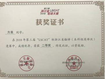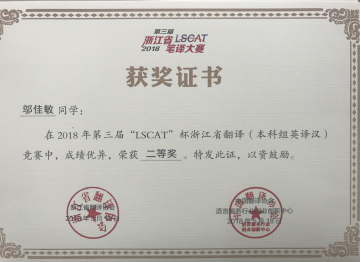 2018年5月18日,2018年第三届“LSCAT杯”浙江省英语笔译大赛圆满落下帷幕。DB彩票 学生在冯巧娥老师、韩晓亚老师的指导下踊跃参与,表现出色,取得了优异的成绩。其中,英语专业方美同学、陈钰颖同学和邬佳敏同学获英译汉翻译方向省级二等奖、吴琼逸同学和华露欣同学荣获省级三等奖,另有14名同学获优胜奖。