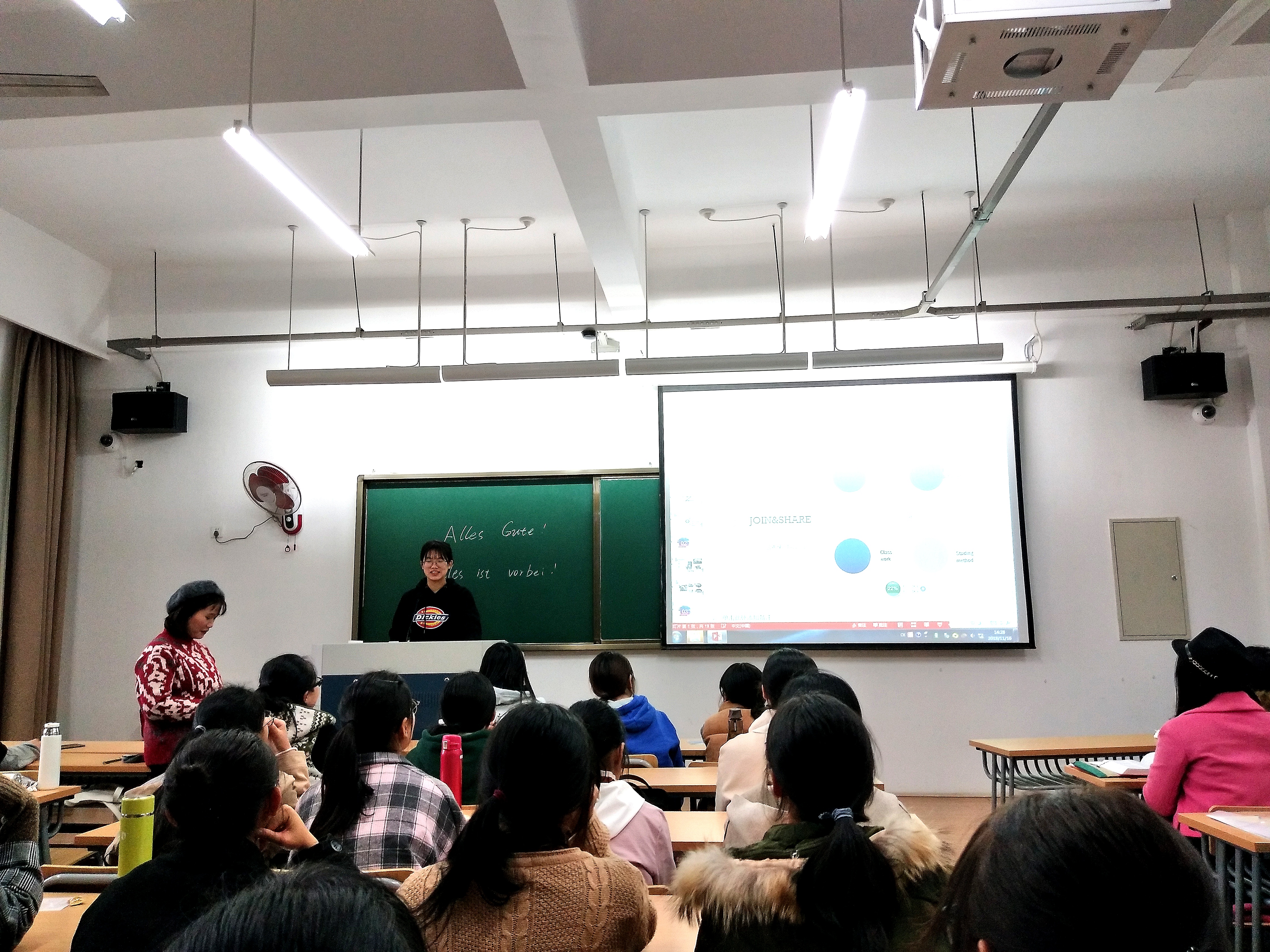 第二位德语班的梁龄丹学姐,则是风趣大方,谈过背诵德语单词的多种方法后,着重强调了综测的评分标准并激励学弟学妹们抓住好时光,不懈学习。