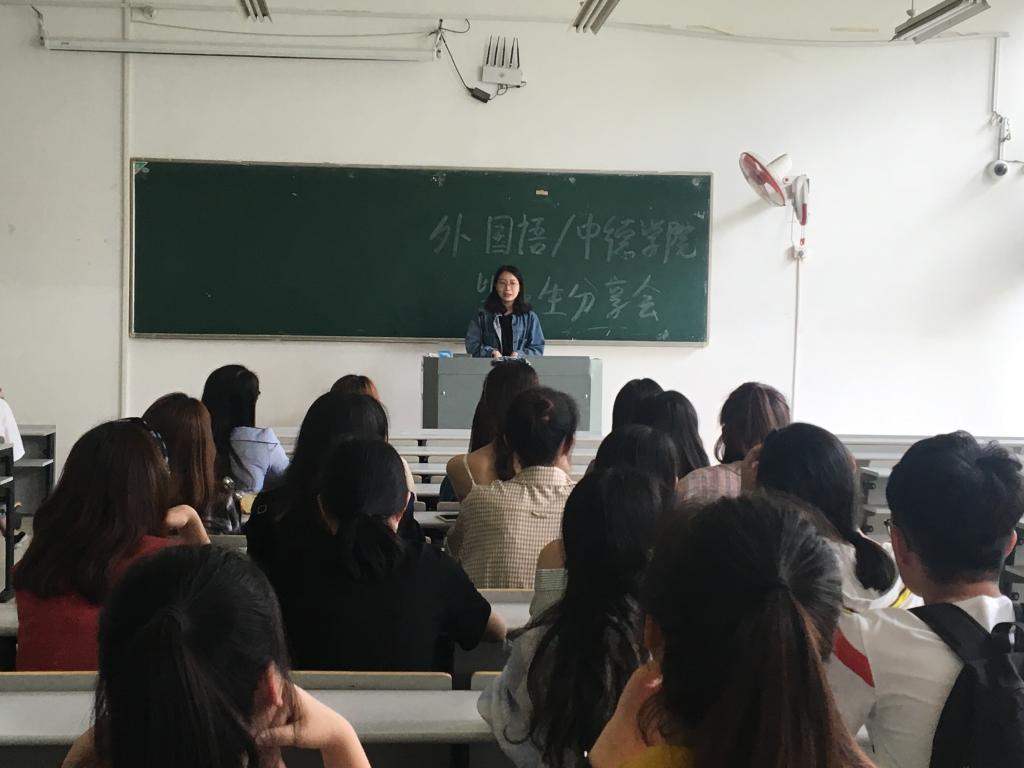 5月12日,外国语/DB彩票 毕业生分享会在A3-113举行,英语专业18届毕业生虞睿涵、杨菲、陈焕新与2016级的学弟学妹们分享了关于政府机构翻译工作、考研以及外贸行业的工作情况。德语专业喻云、殷颖同学也向学弟们传授了工作和深造的经验。