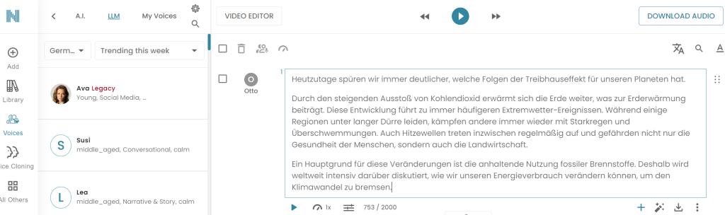 图注:界面中可选择 “ German德语” 语言、Otto(男性)等标准德语音色,设置朗读速度;当前输入文本为ChatGPT根据Motiv导入页提供的单元核心词汇生成的短文,支持单次输入2000字,可批量生成课文朗读音频。