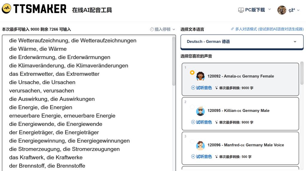图注:界面中可选择 “Deutsch - German德语” 语言、120092(Amala-DE,女性)等标准德语音色,设置文本间隔时间;当前输入文本为单元核心词汇,支持单次输入 9000 字,可批量生成单词朗读音频。