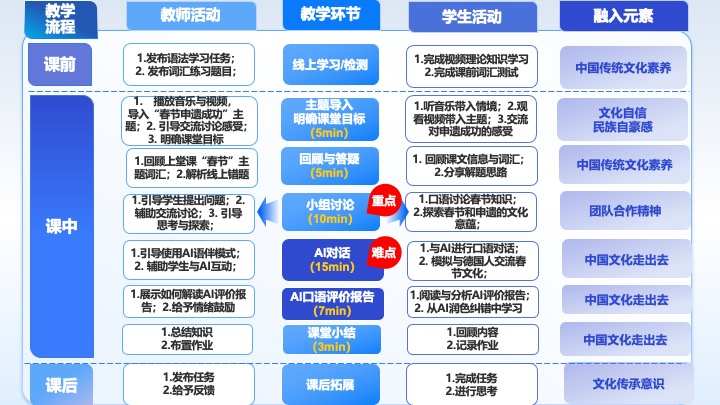 难点: 1.情景模拟-与AI德国母语者口语交流“春节”及口语评价报告分析; |