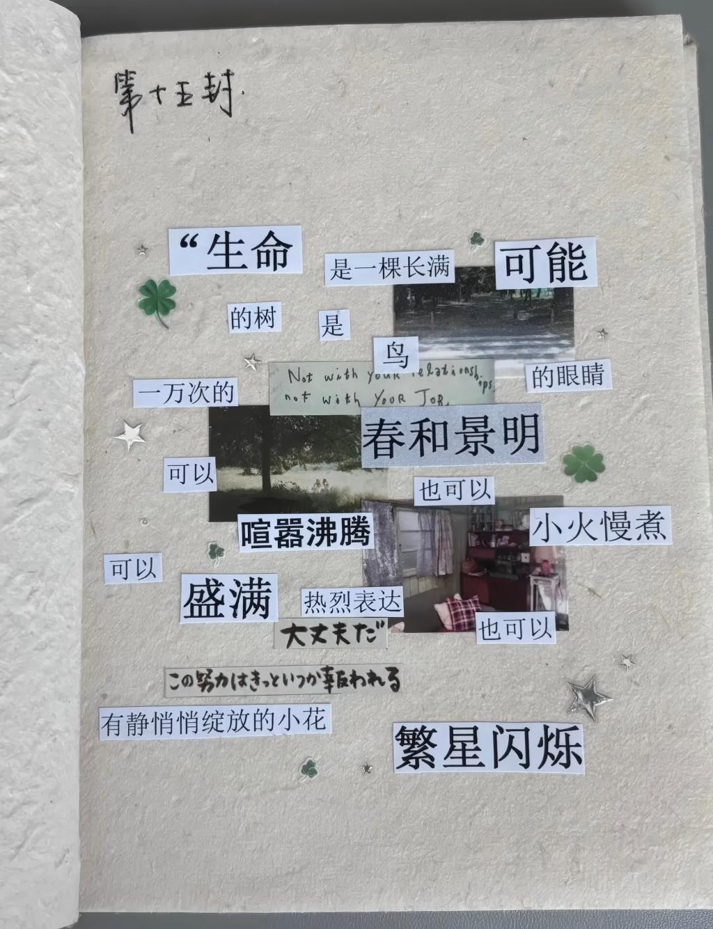 坐在桌前,将这些词句排列组合,宛如在构建一个专属的心灵花园。这过程中,有困惑,有迷茫,那些看似毫无关联的字词在眼前杂乱无章,如同生活中纷繁复杂的琐事交织在一起。这不仅仅是文字的拼凑,更是情绪的梳理、创伤的修复,那些难以言说的情感在诗行中找到了出口,让我们得以窥见内心未曾被察觉的角落,在碎片化的时代里,拼贴出一片宁静且诗意的心灵栖息地,用他人的文字碎片,诉说自己最真挚的心声,完成一场与自我的深度对话。