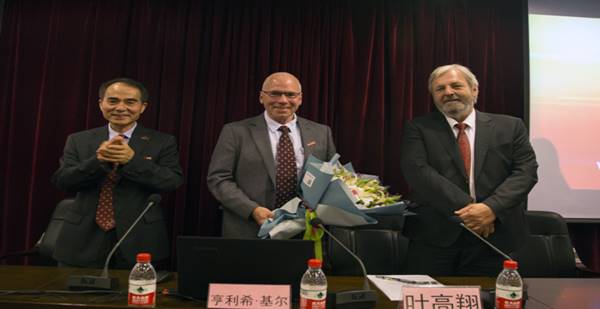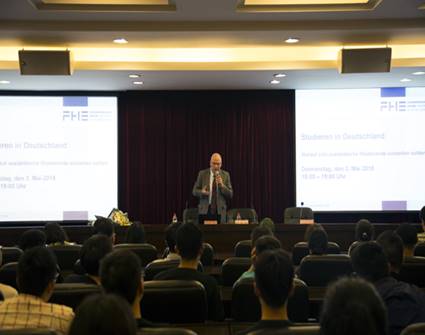 仪式结束后,基尔教授为DB彩票 “2+3”项目学生作了留学德国专题报告,从德国的学制、学期、学分、交通、生活等方面详细介绍了德国的学习和生活