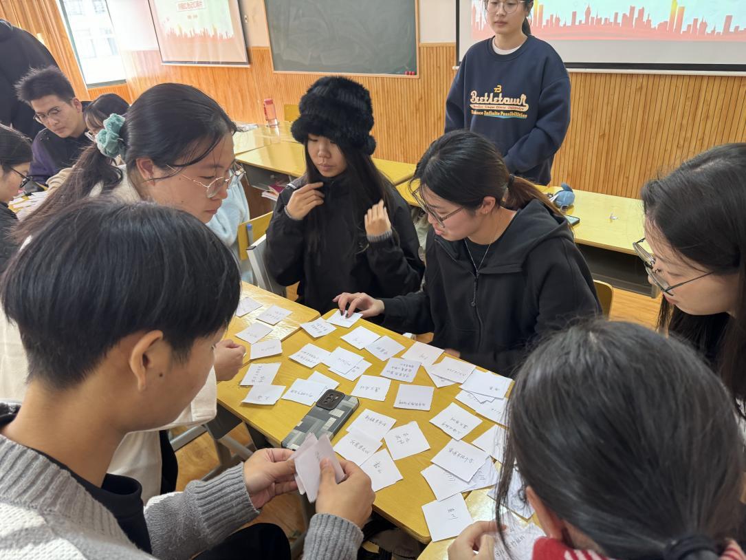 本次活动各位学生通过抽签被分成四个小组,进行两个环节的知识竞赛比拼。第一个环节为在规定时间内,将三类“记忆卡片”正确进行配对,第一类卡片为时间,第二类卡片为地点,第三类则为不同的事件。各小组充分发挥各自的党史知识理论储备,配合默契,最终结果更是旗鼓相当,充分展现了各位党员良好的精神面貌。